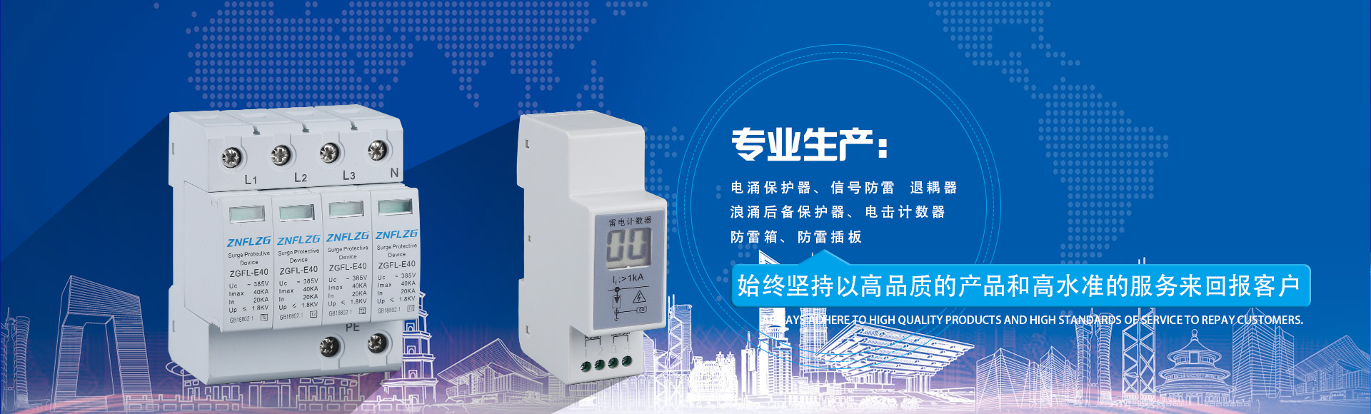 公司主導產品有電涌保護器、信號防雷、退耦器浪涌后備保護器、電擊計數器、防雷箱、防雷插板。